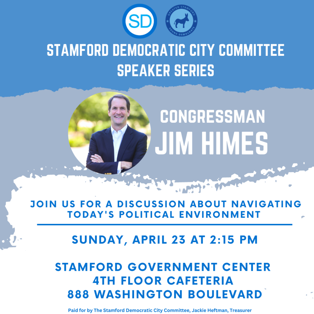 Join fellow Stamford Democrats for a conversation with Congressman Jim Himes about navigating today’s political environment. Stamford Government Center (888 Washington Blvd.), 4th Floor Cafeteria.