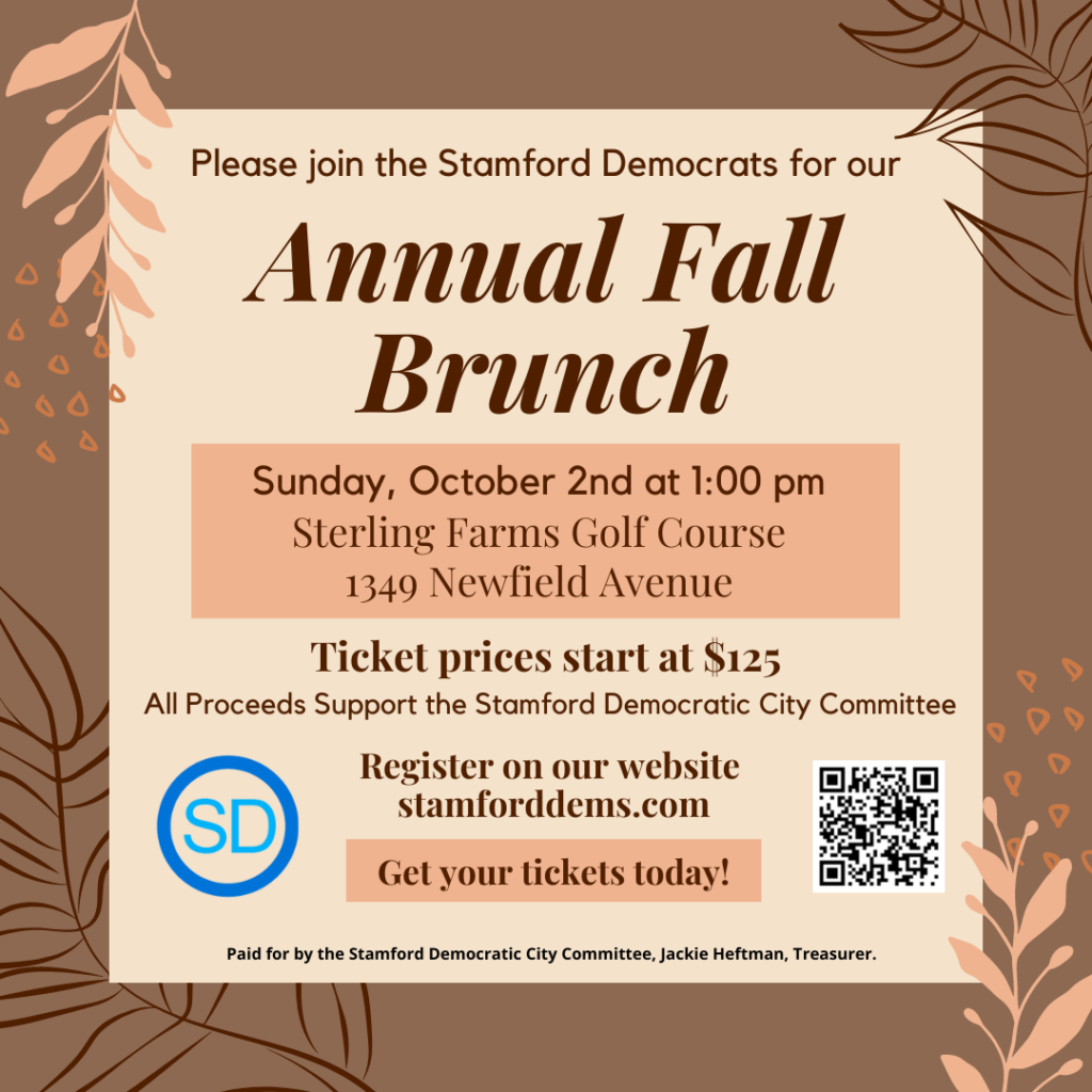 Join us for our annual fundraising brunch, Sunday, October 2nd from 1 pm – 3:00 pm! Tickets start at $125 and the event will be outdoors at Sterling Farms Golf Course. All proceeds support the Stamford Democratic City Committee.