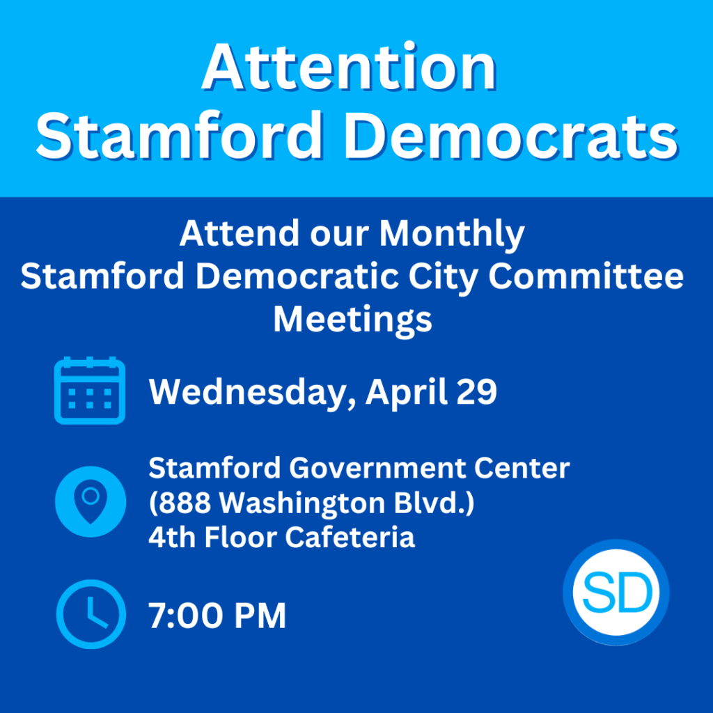 Join fellow Democrats at our monthly DCC general meeting. Stamford Government Center (888 Washington Blvd.), 4th Floor Cafeteria.