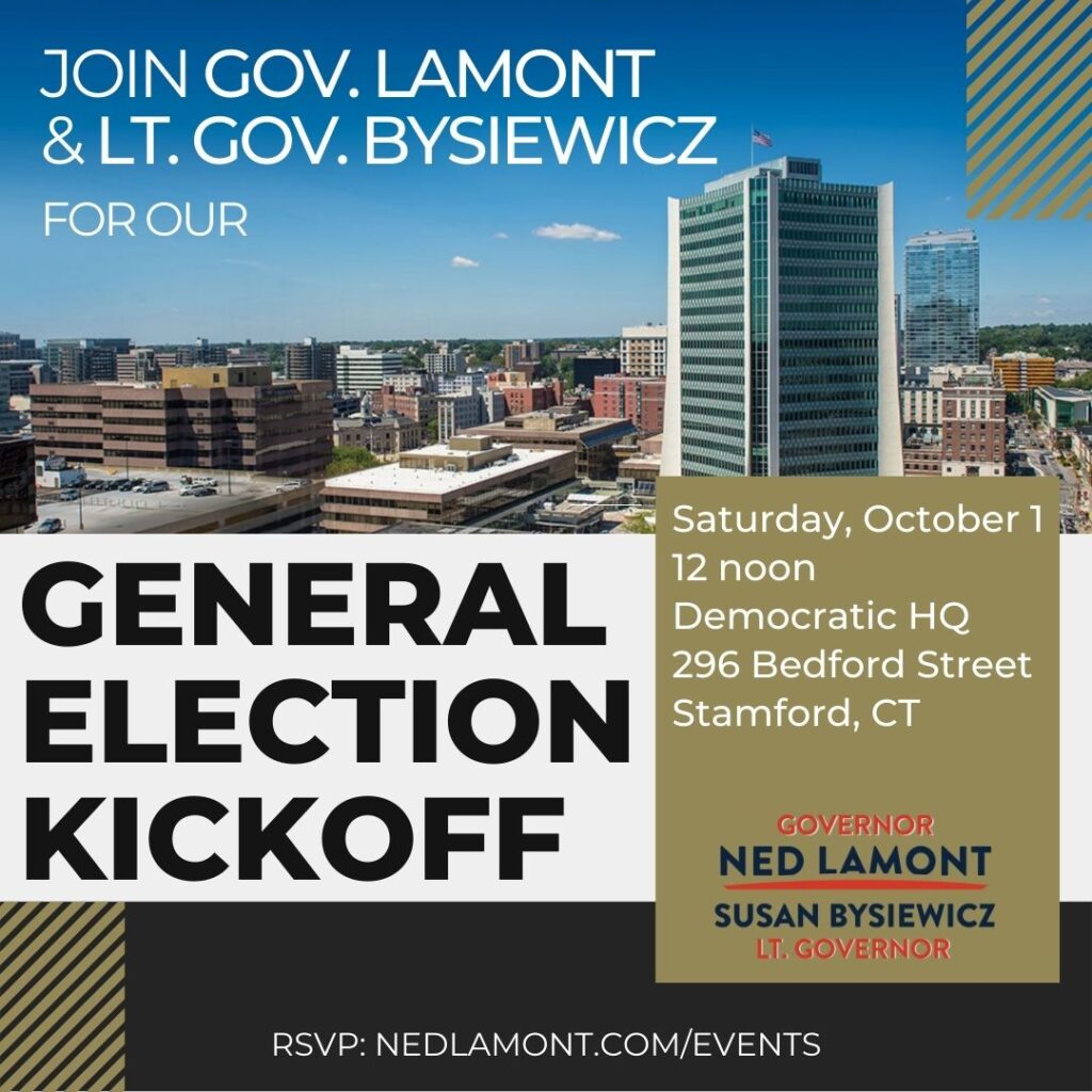 Join Governor Lamont and Lt. Governor Susan Bysiewicz for a campaign kick off on Saturday, October 1 at 12:00 PM at the Stamford Democratic Headquarters (296 Bedford Street) – sign up here.